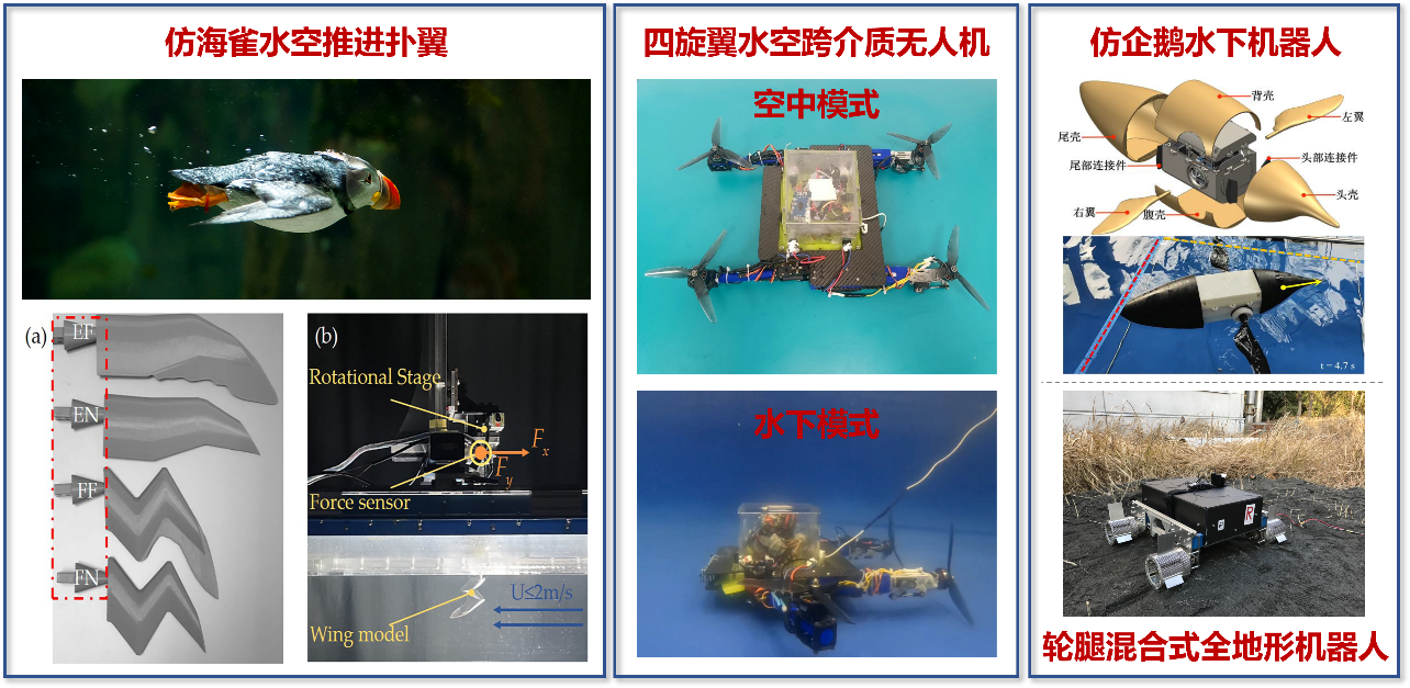 专注于水陆空多域机器人技术,致力于仿生智能与跨介质运动的前沿研究。基于海雀和企鹅的生物运动机理,研发了水空兼容扑翼推进系统及高机动水下机器人;开发了倾转旋翼水空两栖平台,解决了空化抑制与模态切换难题;创新设计了轮腿混合机构,实现复杂环境的自适应运动。形成了"仿生机理-动力学建模-系统实现"的研究体系,在海洋探测、国防安全等领域具有巨大应用潜力。