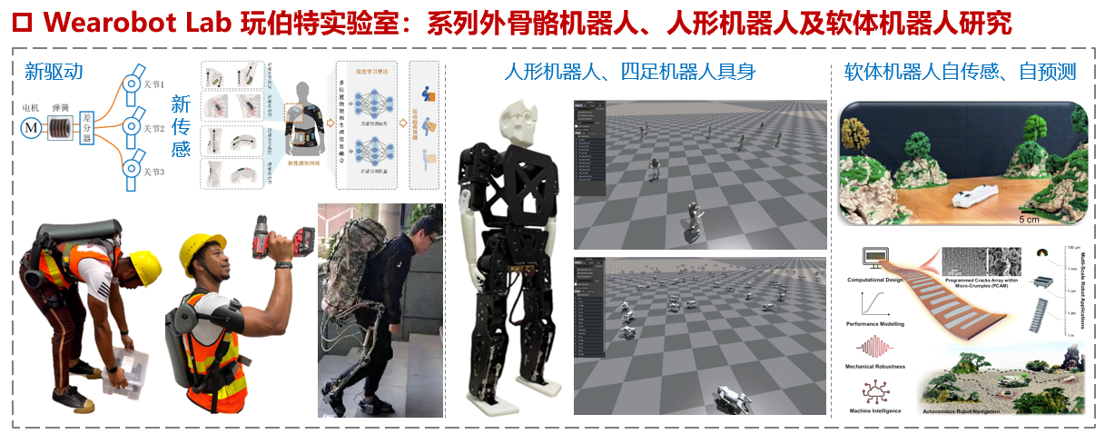 围绕类人机器人的轻柔驱动机理和软性感知方法开展深入研究:创新提出基于串联弹性和绳索驱动的轻柔驱动机理,仅用单执行器同时驱动多个关节,并实现精准的输出力控制;研发具有强鲁棒性的软性传感器,实现了人体运动趋势的软性感知。已研制系列轻量化、柔顺化、软感知的外骨骼机器人、人形机器人及软体机器人,成果发表于自然子刊Nature Communications、IEEE T-RO等顶刊。