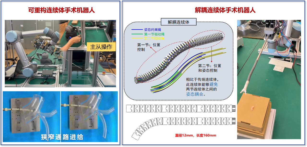 聚焦具有高灵活度与适应性的连续体机器人开展深入研究:研发面向介入手术的微细可重构连续体机器人,实现亚毫米级介入定位;腹腔/胸腔手术的解耦连续体机器人实现灵活操作;具有形状感知的工业检测柔性机器人以及基于二维层叠结构的驱感控一体连续体等。相关研究成果已发表多篇SCI一区文章,并获中国研究生机器人创新设计大赛“集成组”二等奖等奖项。