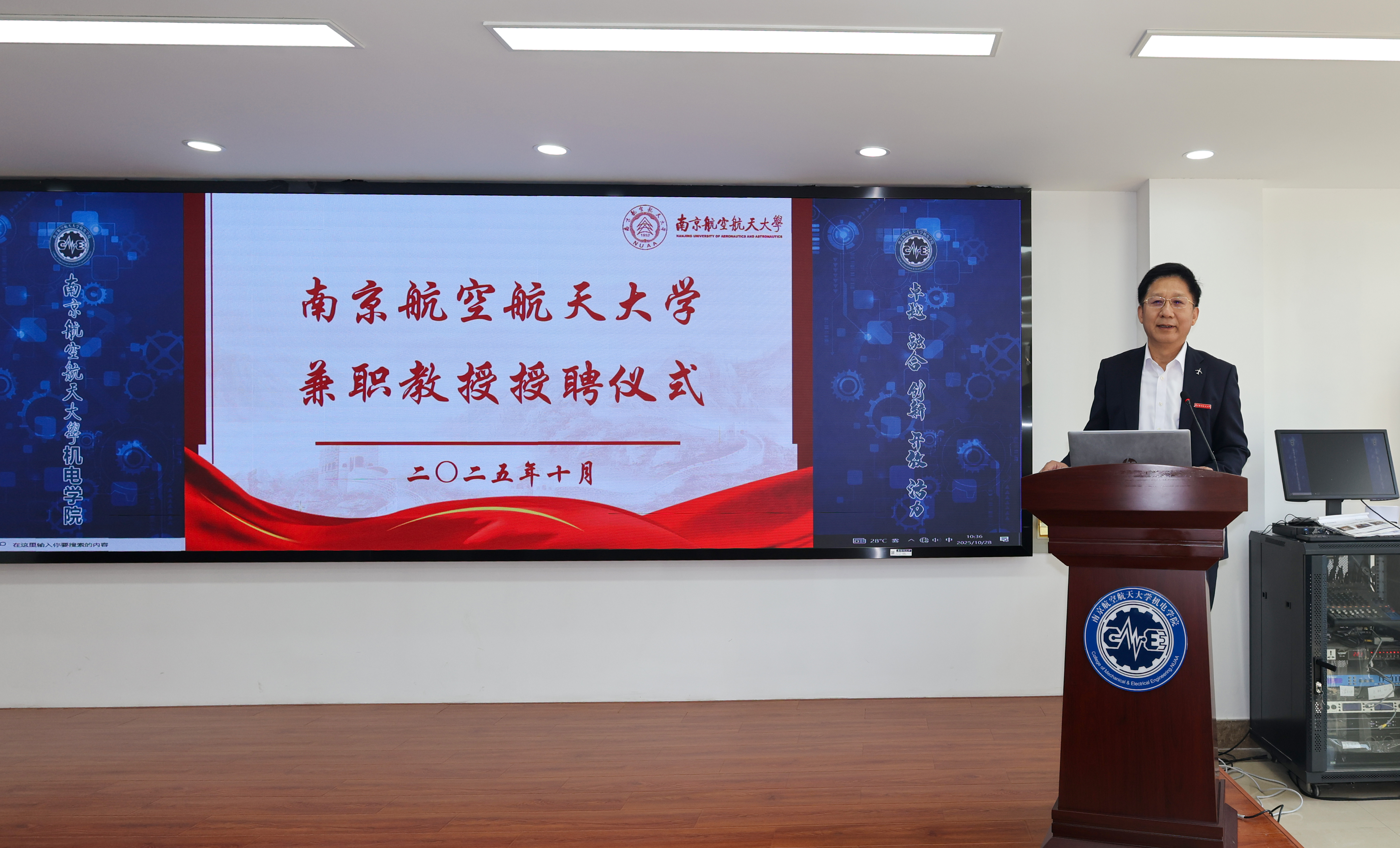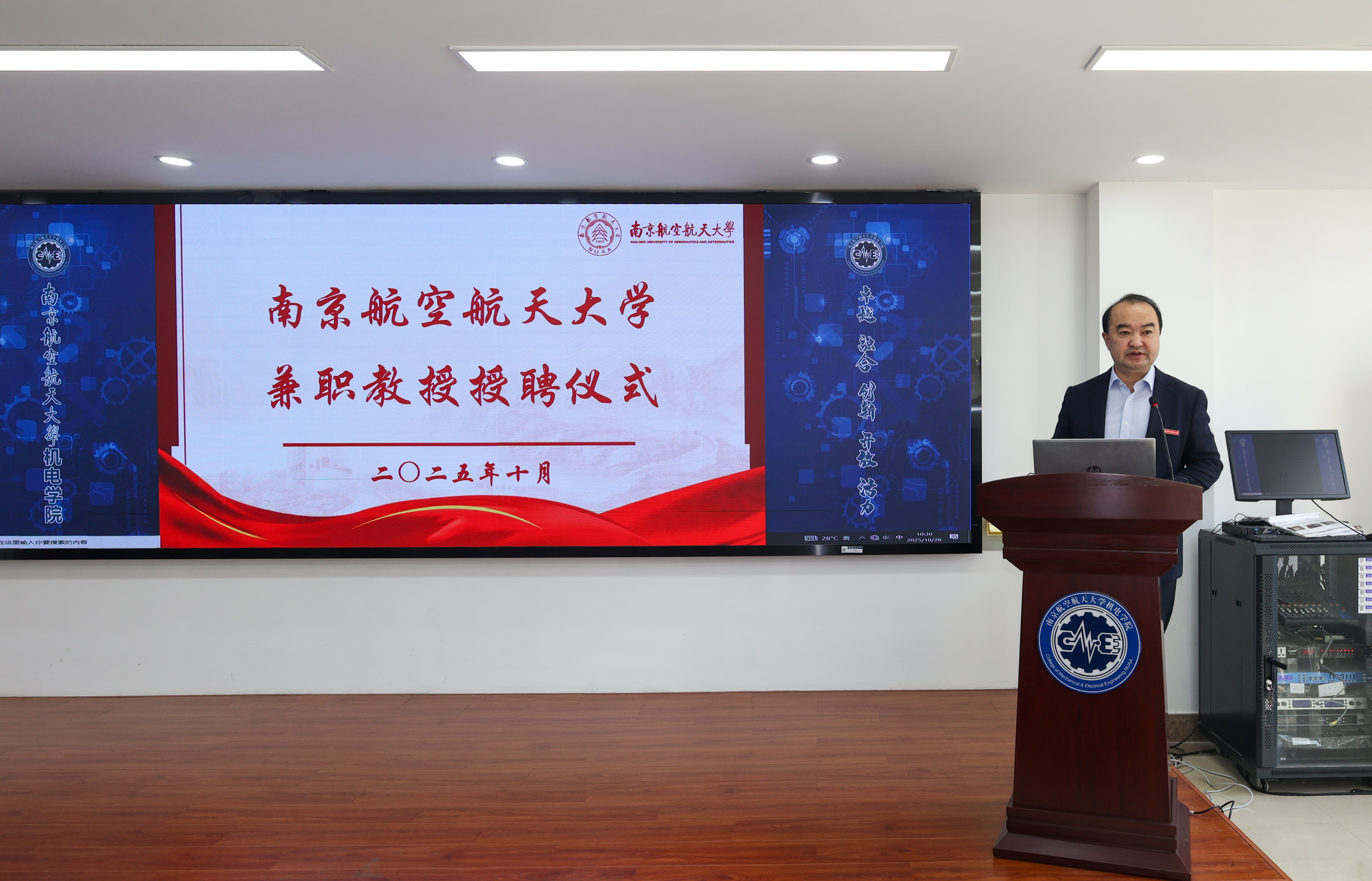 陶勇代表学校对邓玉东长期以来给予学校发展的关心和支持表示衷心感谢,并对其受聘兼职教授致以热烈祝贺。他表示,邓玉东从南航起步,扎根民用航空制造一线,带领沈飞民机实现了从“跟跑”到“并跑”再到“领跑”的跨越式发展,为国家民航事业的发展做出了重要贡献。此次受聘希望能将邓玉东研究员凝聚着实践智慧与行业视野的宝贵财富,转化为滋养南航学子成长的 “养分”,助力培养更多兼具理论素养与实践能力的高素质人才。他强调,在邓玉东的积极推动下,南航与沈飞民机的合作迈向了 “产学研用” 深度融合的新阶段,期待双方以联合实验室为桥梁,在科技攻关、人才培养与成果转化等方面持续深化协同,共同打造校企合作标杆,为航空强国建设贡献力量。