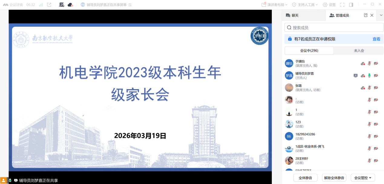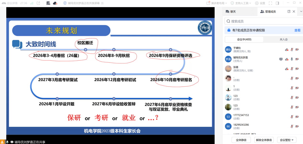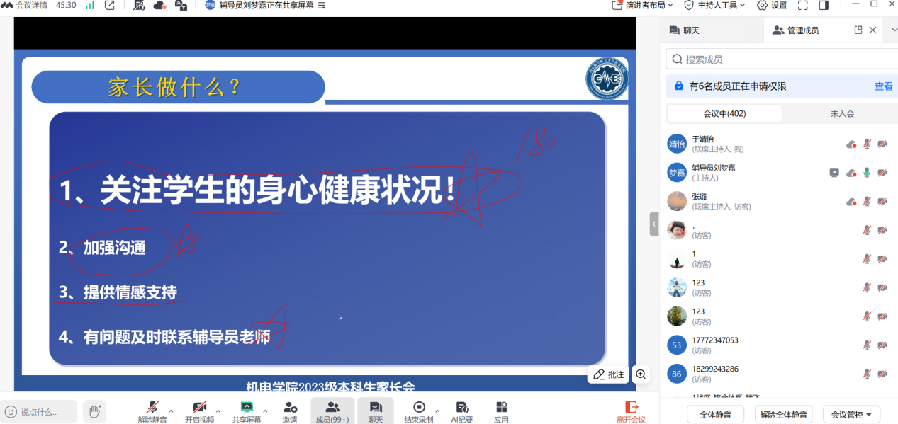 为让家长及时了解学生在校情况及学院育人导向,当晚,学院通过线上会议平台召开了家长会。两位辅导员向与会家长详细通报了下午年级大会的核心内容,包括当前的升学就业形势、学院历年学生去向分析、本年级的学风状况及学校在安全稳定方面的要求与举措。